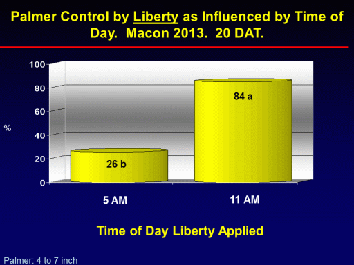 26 b<BR>5 AM<BR>Palmer Control by Liberty as Influenced by Time of Day.  Macon 2013.  20 DAT.<BR>Time of Day Liberty Applied<BR>%<BR>11 AM<BR>84 a<BR>Palmer: 4 to 7 inch<BR>