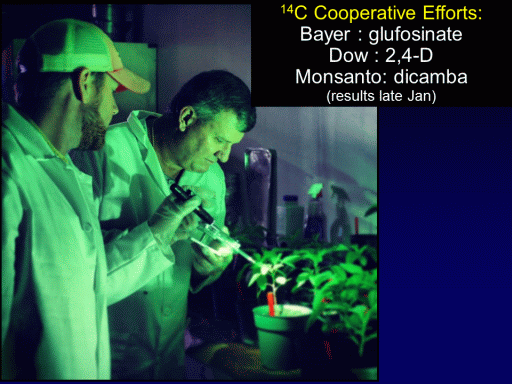 14C Cooperative Efforts: <BR>Bayer : glufosinate <BR>Dow : 2,4-D <BR>Monsanto: dicamba <BR>(results late Jan) <BR>
