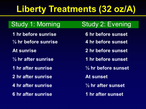 Liberty Treatments (32 oz/A)<BR> <BR>1 hr before sunrise		6 hr before sunset <BR>½ hr before sunrise		4 hr before sunset <BR>At sunrise 			  	2 hr before sunset <BR>½ hr after sunrise	     	 	1 hr before sunset <BR>1 hr after sunrise		 	½ hr before sunset <BR>2 hr after sunrise		 	At sunset  <BR>4 hr after sunrise		 	½ hr after sunset <BR>6 hr after sunrise  		 	1 hr after sunset<BR>Study 1: Morning<BR>Study 2: Evening<BR>