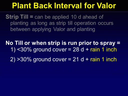Plant Back Interval for Valor<BR>Strip Till = can be applied 10 d ahead of planting as long as strip till operation occurs between applying Valor and planting<BR>No Till or when strip is run prior to spray = 1) <30% ground cover = 28 d + rain 1 inch <BR>   2) >30% ground cover = 21 d + rain 1 inch<BR>