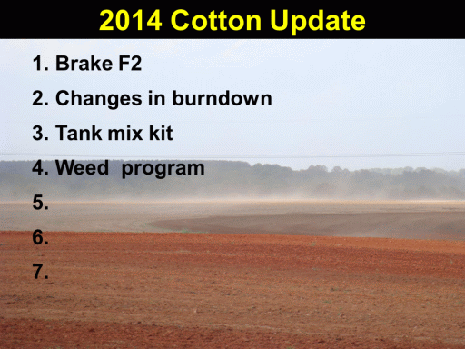 2014 Cotton Update<BR> Brake F2 <BR> Changes in burndown <BR> Tank mix kit <BR> Weed  program <BR>  <BR>  <BR> <BR>