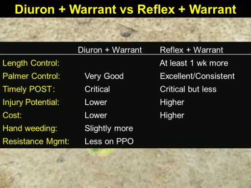 Diuron + Warrant vs Reflex + Warrant<BR>			Diuron + Warrant	   Reflex + Warrant <BR>Length Control:				   At least 1 wk more <BR>Palmer Control:	   Very Good		   Excellent/Consistent <BR>Timely POST	:	   Critical		   Critical but less <BR>Injury Potential:	   Lower		   Higher <BR>Cost:			   Lower		   Higher <BR>Hand weeding:	   Slightly more <BR>Resistance Mgmt:	   Less on PPO	   <BR>