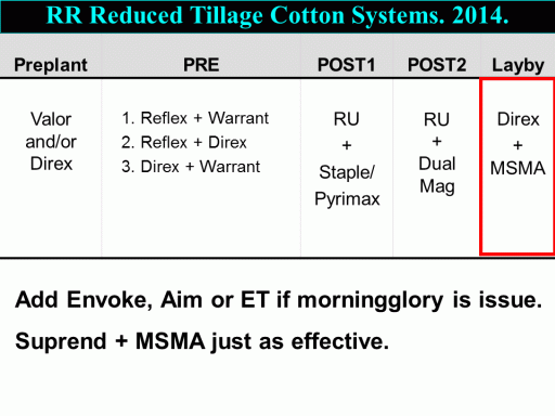 RR Reduced Tillage Cotton Systems. 2014.<BR>Add Envoke, Aim or ET if morningglory is issue. <BR>Suprend + MSMA just as effective.<BR>