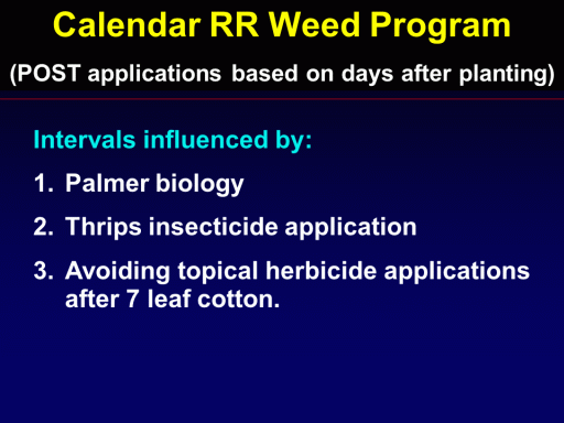 Calendar RR Weed Program <BR>(POST applications based on days after planting)<BR>Intervals influenced by: <BR>Palmer biology <BR>Thrips insecticide application <BR>Avoiding topical herbicide applications after 7 leaf cotton.<BR>