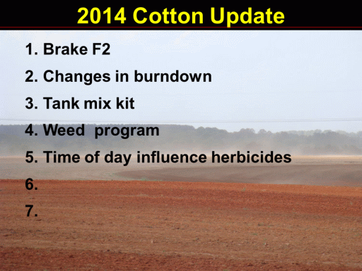 2014 Cotton Update<BR> Brake F2 <BR> Changes in burndown <BR> Tank mix kit <BR> Weed  program <BR> Time of day influence herbicides <BR>  <BR>  <BR>