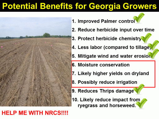 Potential Benefits for Georgia Growers<BR>Improved Palmer control <BR>Reduce herbicide input over time <BR>Protect herbicide chemistry <BR>Less labor (compared to tillage) <BR>Mitigate wind and water erosion <BR>Moisture conservation <BR>Likely higher yields on dryland <BR>Possibly reduce irrigation <BR>Reduces Thrips damage <BR> Likely reduce impact from ryegrass and horseweed.<BR>HELP ME WITH NRCS!!!!<BR>