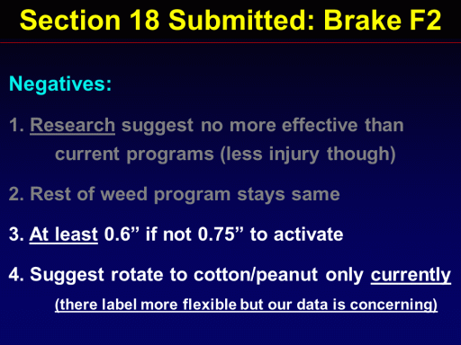 Section 18 Submitted: Brake F2<BR>Negatives: <BR>1. Research suggest no more effective than 	current programs (less injury though) <BR>2. Rest of weed program stays same <BR>3. At least 0.6” if not 0.75” to activate <BR>4. Suggest rotate to cotton/peanut only currently 	(there label more flexible but our data is concerning) <BR>