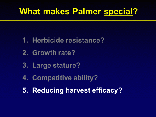 What makes Palmer special? <BR> Herbicide resistance? <BR> Growth rate? <BR> Large stature? <BR> Competitive ability? <BR> Reducing harvest efficacy?<BR>