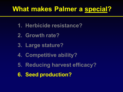 What makes Palmer a special? <BR> Herbicide resistance? <BR> Growth rate? <BR> Large stature? <BR> Competitive ability? <BR> Reducing harvest efficacy? <BR> Seed production?<BR>