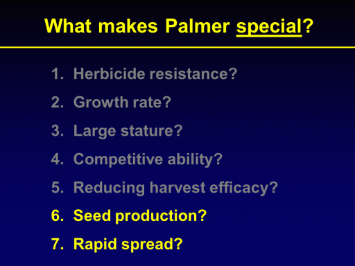 What makes Palmer special? <BR> Herbicide resistance? <BR> Growth rate? <BR> Large stature? <BR> Competitive ability? <BR> Reducing harvest efficacy? <BR> Seed production? <BR> Rapid spread?<BR>