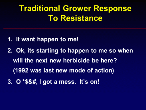 Traditional Grower Response To Resistance<BR>1.  It want happen to me! <BR>2.  Ok, its starting to happen to me so when will the next new herbicide be here?      (1992 was last new mode of action) <BR>3.  O *$&#, I got a mess.  It’s on!<BR>