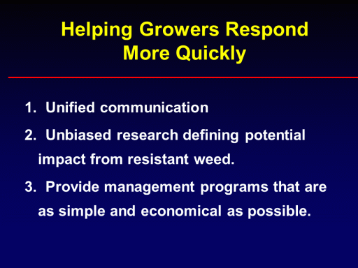 Helping Growers Respond More Quickly<BR>1.  Unified communication <BR>2.  Unbiased research defining potential impact from resistant weed. <BR>3.  Provide management programs that are as simple and economical as possible.<BR>