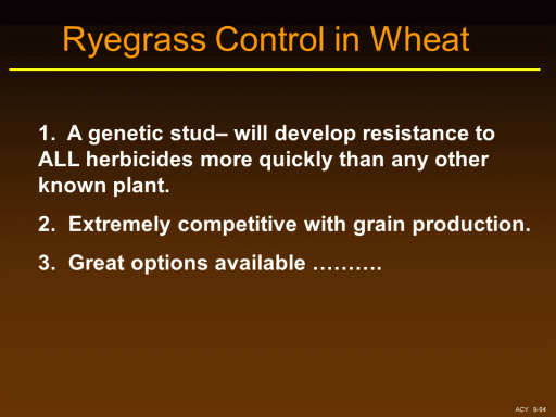 1.  A genetic stud– will develop resistance to ALL herbicides more quickly than any other known plant. <BR>2.  Extremely competitive with grain production. <BR>3.  Great options available ……….<BR>