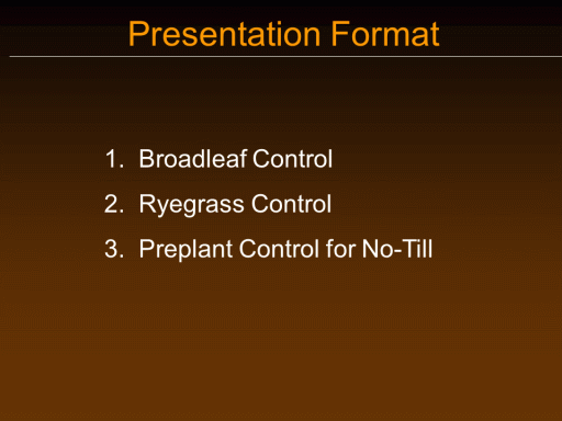 <BR>1.  Broadleaf Control <BR>2.  Ryegrass Control <BR>3.  Preplant Control for No-Till<BR>Presentation Format<BR>