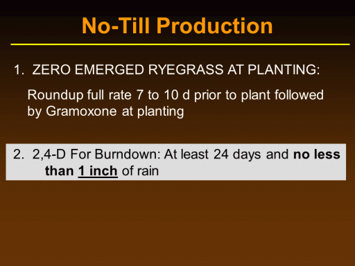 1.  ZERO EMERGED RYEGRASS AT PLANTING: <BR>Roundup full rate 7 to 10 d prior to plant followed by Gramoxone at planting<BR>No-Till Production<BR> 2.  2,4-D For Burndown: At least 24 days and no less 	than 1 inch of rain<BR>