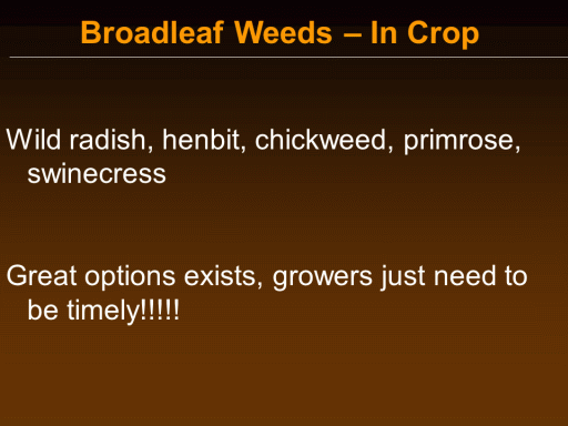 Broadleaf Weeds – In Crop <BR> <BR> <BR>Wild radish, henbit, chickweed, primrose, swinecress <BR> <BR>Great options exists, growers just need to be timely!!!!!<BR>