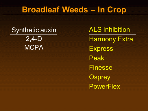 Broadleaf Weeds – In Crop<BR>Synthetic auxin <BR>2,4-D <BR>MCPA<BR>ALS Inhibition <BR>Harmony Extra <BR>Express <BR>Peak <BR>Finesse <BR>Osprey <BR>PowerFlex<BR>
