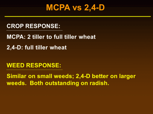 MCPA vs 2,4-D <BR>CROP RESPONSE: <BR>MCPA: 2 tiller to full tiller wheat <BR>2,4-D: full tiller wheat<BR>WEED RESPONSE: <BR>Similar on small weeds; 2,4-D better on larger weeds.  Both outstanding on radish.<BR>