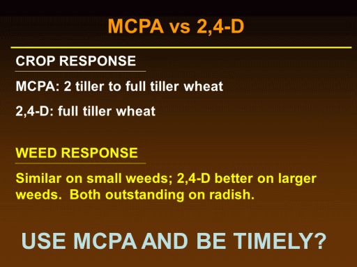 MCPA vs 2,4-D <BR>CROP RESPONSE <BR>MCPA: 2 tiller to full tiller wheat <BR>2,4-D: full tiller wheat<BR>WEED RESPONSE <BR>Similar on small weeds; 2,4-D better on larger weeds.  Both outstanding on radish.<BR>USE MCPA AND BE TIMELY?<BR>