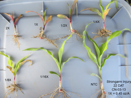 Strongarm Injury <BR>22 DAT <BR>CN-03-13 <BR>1X = 0.45 oz/A<BR>2X<BR>1X<BR>1/2X<BR>1/4X<BR>1/8X<BR>1/16X<BR>NTC<BR>
