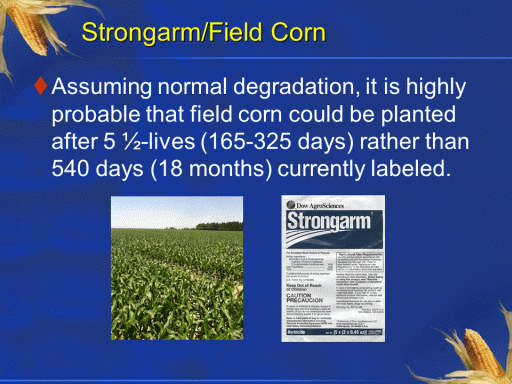 Strongarm/Field Corn<BR>Assuming normal degradation, it is highly probable that field corn could be planted after 5 ½-lives (165-325 days) rather than 540 days (18 months) currently labeled. <BR> <BR>