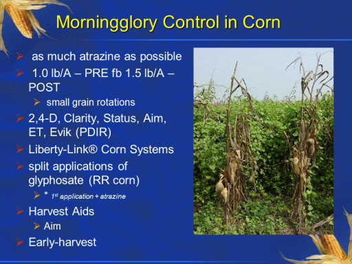 Morningglory Control in Corn<BR> as much atrazine as possible <BR> 1.0 lb/A – PRE fb 1.5 lb/A – POST <BR> small grain rotations <BR>2,4-D, Clarity, Status, Aim, ET, Evik (PDIR) <BR>Liberty-Link® Corn Systems <BR>split applications of glyphosate (RR corn) <BR>* 1st application + atrazine <BR>Harvest Aids <BR>Aim <BR>Early-harvest		 <BR> <BR> <BR> <BR>