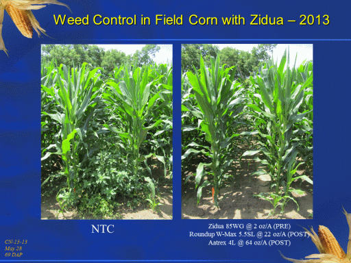 Weed Control in Field Corn with Zidua – 2013 <BR>CN-15-13 <BR>May 28 <BR>69 DAP<BR>NTC<BR>Zidua 85WG @ 2 oz/A (PRE) <BR>Roundup W-Max 5.5SL @ 22 oz/A (POST) <BR>Aatrex 4L @ 64 oz/A (POST)<BR>
