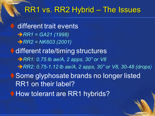 RR1 vs. RR2 Hybrid – The Issues<BR> different trait events <BR>RR1 = GA21 (1998) <BR>RR2 = NK603 (2001) <BR>different rate/timing structures <BR>RR1: 0.75 lb ae/A, 2 apps, 30” or V8 <BR>RR2: 0.75-1.12 lb ae/A, 2 apps, 30” or V8, 30-48 (drops) <BR>Some glyphosate brands no longer listed RR1 on their label? <BR>How tolerant are RR1 hybrids?  <BR>