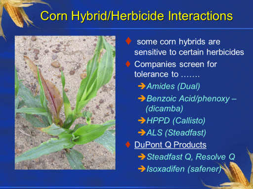 Corn Hybrid/Herbicide Interactions<BR> some corn hybrids are sensitive to certain herbicides <BR>Companies screen for tolerance to ……. <BR>Amides (Dual) <BR>Benzoic Acid/phenoxy – (dicamba) <BR>HPPD (Callisto) <BR>ALS (Steadfast) <BR>DuPont Q Products <BR>Steadfast Q, Resolve Q <BR>Isoxadifen (safener) <BR>