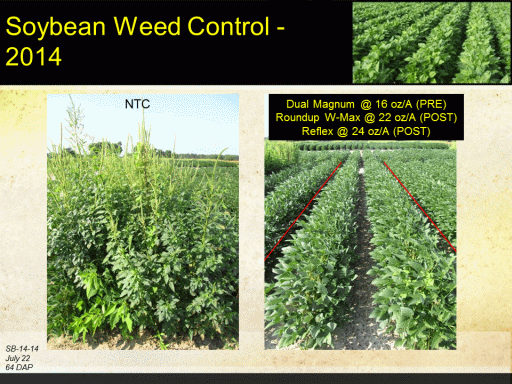 Soybean Weed Control - 2014<BR>NTC<BR>Dual Magnum @ 16 oz/A (PRE) <BR>Roundup W-Max @ 22 oz/A (POST) <BR>Reflex @ 24 oz/A (POST)<BR>SB-14-14 <BR>July 22 <BR>64 DAP<BR>