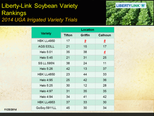 Liberty-Link Soybean Variety Rankings 2014 UGA Irrigated Variety Trials<BR>11/25/2014<BR>
