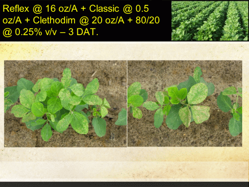 Reflex @ 16 oz/A + Classic @ 0.5 oz/A + Clethodim @ 20 oz/A + 80/20 @ 0.25% v/v – 3 DAT.<BR>