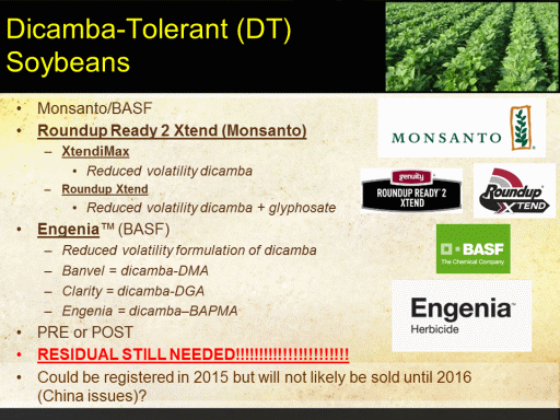 Dicamba-Tolerant (DT) Soybeans<BR>Monsanto/BASF <BR>Roundup Ready 2 Xtend (Monsanto) <BR>XtendiMax <BR>Reduced volatility dicamba <BR>Roundup Xtend <BR>Reduced volatility dicamba + glyphosate <BR>Engenia™ (BASF) <BR>Reduced volatility formulation of dicamba <BR>Banvel = dicamba-DMA <BR>Clarity = dicamba-DGA <BR>Engenia = dicamba–BAPMA <BR>PRE or POST <BR>RESIDUAL STILL NEEDED!!!!!!!!!!!!!!!!!!!!!!! <BR>Could be registered in 2015 but will not likely be sold until 2016 (China issues)?<BR>