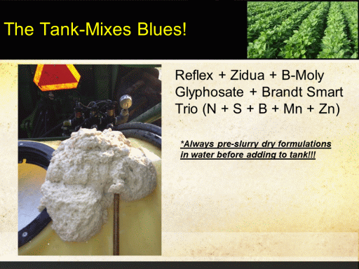 The Tank-Mixes Blues!<BR>Reflex + Zidua + B-Moly <BR>Glyphosate + Brandt Smart <BR>Trio (N + S + B + Mn + Zn)<BR>*Always pre-slurry dry formulations <BR>in water before adding to tank!!!<BR>