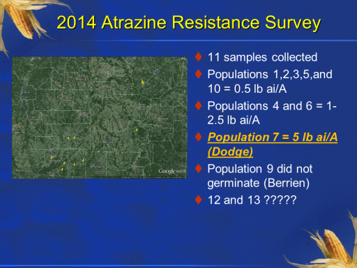 2014 Atrazine Resistance Survey<BR>11 samples collected  <BR>Populations 1,2,3,5,and 10 = 0.5 lb ai/A <BR>Populations 4 and 6 = 1-2.5 lb ai/A <BR>Population 7 = 5 lb ai/A (Dodge) <BR>Population 9 did not germinate (Berrien) <BR>12 and 13 ????? <BR>