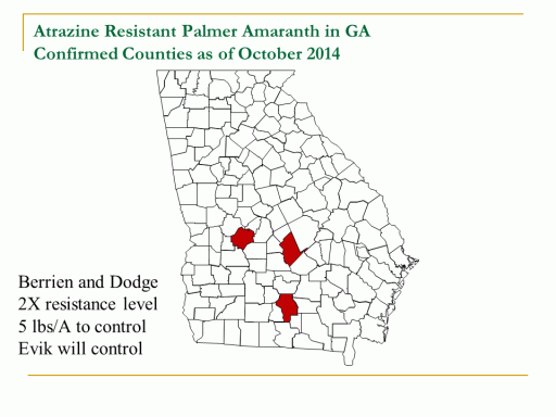 Atrazine Resistant Palmer Amaranth in GA Confirmed Counties as of October 2014<BR>Berrien and Dodge <BR>2X resistance level <BR>5 lbs/A to control <BR>Evik will control<BR>