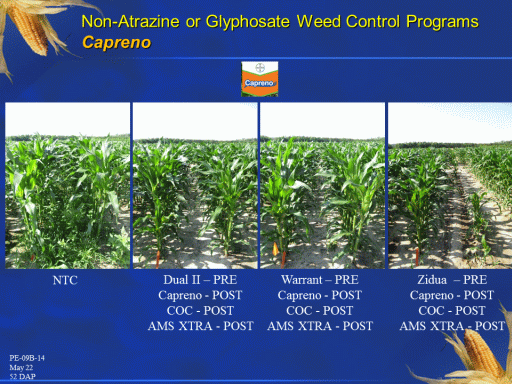 Non-Atrazine or Glyphosate Weed Control Programs Capreno<BR>PE-09B-14 <BR>May 22 <BR>52 DAP<BR>NTC<BR>Dual II – PRE <BR>Capreno - POST <BR>COC - POST <BR>AMS XTRA - POST<BR>Warrant – PRE <BR>Capreno - POST <BR>COC - POST <BR>AMS XTRA - POST<BR>Zidua  – PRE <BR>Capreno - POST <BR>COC - POST <BR>AMS XTRA - POST<BR>