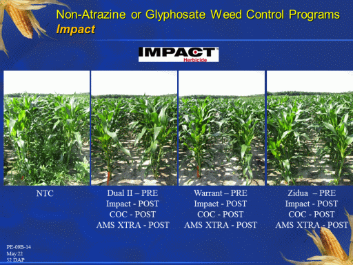 Non-Atrazine or Glyphosate Weed Control Programs Impact<BR>PE-09B-14 <BR>May 22 <BR>52 DAP<BR>NTC<BR>Dual II – PRE <BR>Impact - POST <BR>COC - POST <BR>AMS XTRA - POST<BR>Warrant – PRE <BR>Impact - POST <BR>COC - POST <BR>AMS XTRA - POST<BR>Zidua  – PRE <BR>Impact - POST <BR>COC - POST <BR>AMS XTRA - POST<BR>