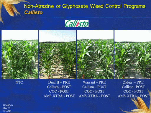 Non-Atrazine or Glyphosate Weed Control Programs Callisto<BR>PE-09B-14 <BR>May 22 <BR>52 DAP<BR>NTC<BR>Dual II – PRE <BR>Callisto - POST <BR>COC - POST <BR>AMS XTRA - POST<BR>Warrant – PRE <BR>Callisto - POST <BR>COC - POST <BR>AMS XTRA - POST<BR>Zidua  – PRE <BR>Callisto- POST <BR>COC - POST <BR>AMS XTRA - POST<BR>