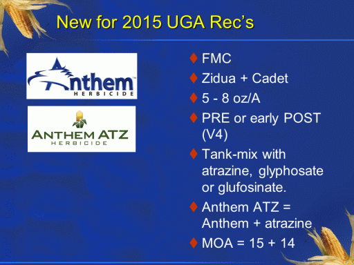 New for 2015 UGA Rec’s<BR>FMC <BR>Zidua + Cadet <BR>5 - 8 oz/A <BR>PRE or early POST (V4) <BR>Tank-mix with atrazine, glyphosate  or glufosinate. <BR>Anthem ATZ = Anthem + atrazine <BR>MOA = 15 + 14<BR>