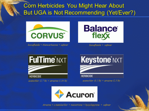 Corn Herbicides You Might Here About But UGA is Not Recommending (Yet/Ever?)<BR>Isoxaflutole + thiencarbazone + safener<BR>Isoxaflutole +  safener<BR>acetochlor (2.7 lb) + atrazine (1.34 lb)<BR>acetochlor (3.1 lb) + atrazine (2.5 lb)<BR>Atrazine + s-metolachlor + mesiotrione + bycyclopyrone +  safener<BR>