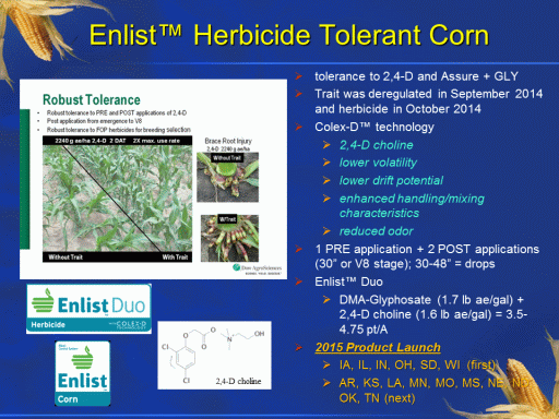 Enlist™ Herbicide Tolerant Corn<BR>tolerance to 2,4-D and Assure + GLY <BR>Trait was deregulated in September 2014 and herbicide in October 2014 <BR>Colex-D™ technology <BR>2,4-D choline <BR>lower volatility <BR>lower drift potential <BR>enhanced handling/mixing characteristics <BR>reduced odor <BR>1 PRE application + 2 POST applications (30” or V8 stage); 30-48” = drops <BR>Enlist™ Duo <BR>DMA-Glyphosate (1.7 lb ae/gal) + 2,4-D choline (1.6 lb ae/gal) = 3.5-4.75 pt/A <BR>2015 Product Launch <BR>IA, IL, IN, OH, SD, WI  (first) <BR>AR, KS, LA, MN, MO, MS, NE, ND, OK, TN (next)<BR>2,4-D choline<BR>