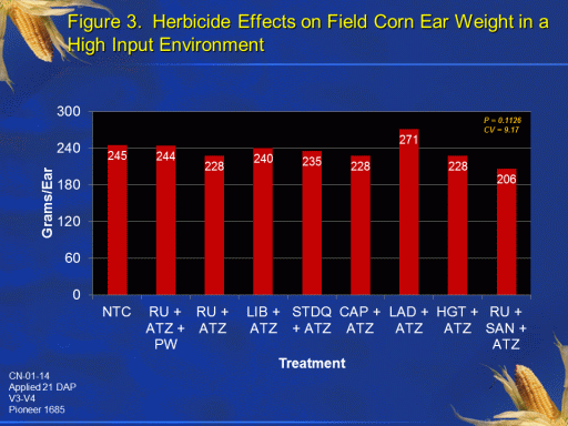 Figure 3.  Herbicide Effects on Field Corn Ear Weight in a High Input Environment <BR>CN-01-14 <BR>Applied 21 DAP <BR>V3-V4 <BR>Pioneer 1685<BR>P = 0.1126 <BR>CV = 9.17<BR>