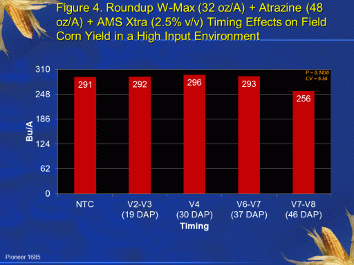 Figure 4. Roundup W-Max (32 oz/A) + Atrazine (48 oz/A) + AMS Xtra (2.5% v/v) Timing Effects on Field Corn Yield in a High Input Environment<BR>Pioneer 1685<BR>P = 0.1430 <BR>CV = 6.56<BR>