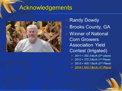 Acknowledgements<BR>Randy Dowdy <BR>Brooks County, GA <BR>Winner of National Corn Growers Association Yield Contest (Irrigated) <BR>2011 = 352.3 Bu/A (2nd place) <BR>2012 = 372.3 Bu/A (1st Place) <BR>2013 = 405.1 Bu/A (2nd Place) <BR>2014 = 503.7 Bu/A (1st Place)<BR>