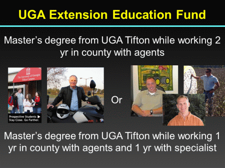 UGA Extension Education Fund<BR>Master’s degree from UGA Tifton while working 2 yr in county with agents <BR> <BR> <BR> <BR>   Or <BR> <BR> <BR>Master’s degree from UGA Tifton while working 1 yr in county with agents and 1 yr with specialist <BR>