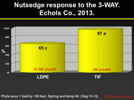 Nutsedge response to the 3-WAY.  Echols Co., 2013.<BR>Plots were 1 bed by 150 feet. Spring soil temp 64. (Veg 13-13)<BR>LDPE<BR>TIF<BR>65 c<BR>97 a<BR>%<BR>290 plant/A<BR>37,265 plant/A<BR>319,250 plant/A check<BR>