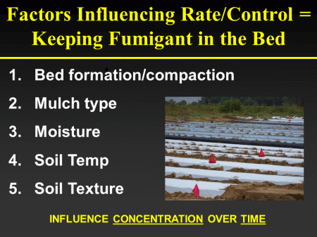 Factors Influencing Rate/Control = Keeping Fumigant in the Bed <BR>1.  <BR>Bed formation/compaction <BR>Mulch type <BR>Moisture <BR>Soil Temp <BR>Soil Texture<BR>INFLUENCE CONCENTRATION OVER TIME<BR>