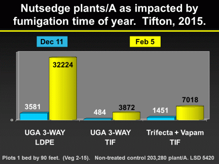 Nutsedge plants/A as impacted by fumigation time of year.  Tifton, 2015.<BR>Plots 1 bed by 90 feet.  (Veg 2-15).   Non-treated control 203,280 plant/A. LSD 5420 <BR>UGA 3-WAY <BR>LDPE<BR>UGA 3-WAY <BR>TIF<BR>Trifecta + Vapam <BR>TIF<BR>32224 <BR>3581<BR>484<BR>1451<BR>3872<BR>7018 <BR>Dec 11<BR>Feb 5<BR>