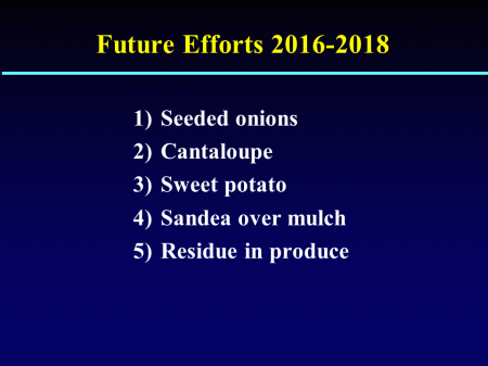 Future Efforts 2016-2018<BR>Seeded onions <BR>Cantaloupe <BR>Sweet potato <BR>Sandea over mulch <BR>Residue in produce <BR> <BR> <BR> <BR>